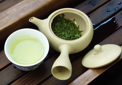 今日の朝茶は一人で小さな急須に足久保手摘み茶。1人で楽しみます。