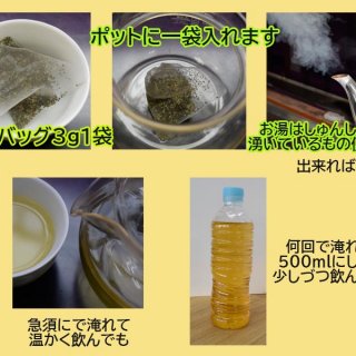 ②1袋のティーバッグ(3g)につき、500ccのお湯で抽出します。(しっかりと熱いお湯(80℃以上)で淹れるほどメチル化カテキンがしっかりと浸出します)